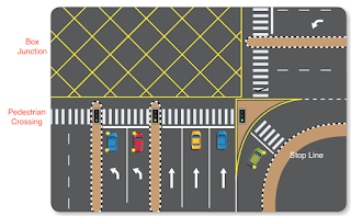Large intersections are marked with a large yellow box with diagonal squares. this is known as a box junction. it is to indicate to drivers that they must not block the intersection when traffic is heavily congested. Signs will warn drivers not to queue across the intersection. You can see Stop Line, Pedestrian Crossing and Box Junction in this diagram below.